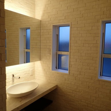 鏡の裏に設置した間接照明がタイルの陰影を浮かび上がらせます!