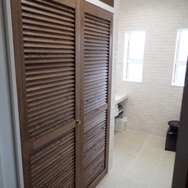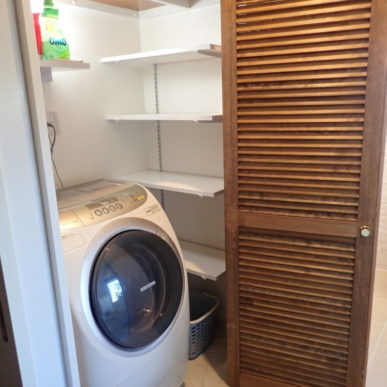 どうしても生活感の出てしまう洗濯機は造作した木製扉の収納庫へ隠しています。可動棚を設置して使い勝手も◎