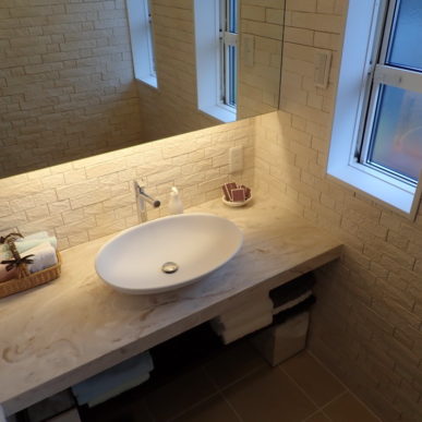 湿気や匂いがこもりがちな洗面室は壁全面にエコカラットを施工し、高級感のある雰囲気に。