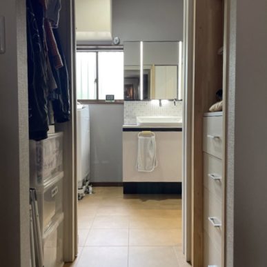 以前はキッチンを横切らないと洗面・浴室に入れませんでしたが、今回のリフォームでは寝室のクローゼットを壊し、洗面所への入り口とコンパクトなウォークインクローゼットを設置。