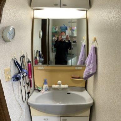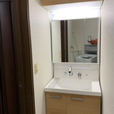 洗面室の壁紙を張り替えるタイミングで既設洗面化粧台を外さなければならなかったため、せっかくならと化粧台も新品へ取替いたしました。