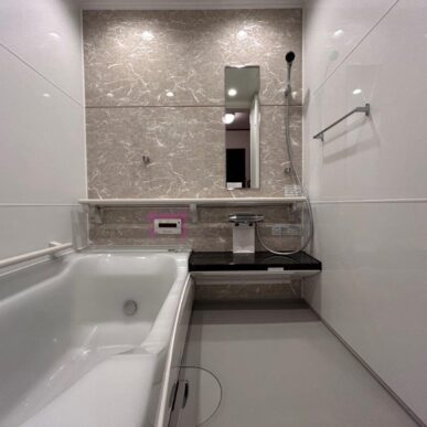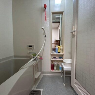 今はまだまだお元気なご夫婦ですが、今後のことも考えて浴室の鏡面には手すり兼収納を設置し、浴槽はまたぎが浅いタイプを採用いたしました!