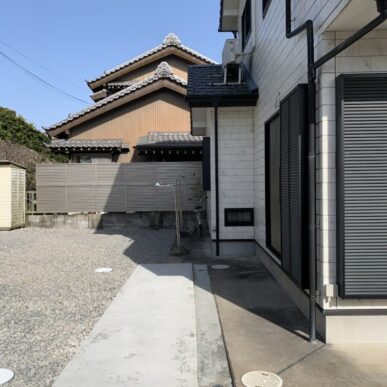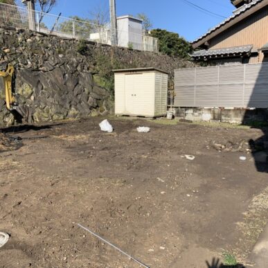 奥の擁壁の上には道路があり、雨が降ると道路の水がすべてお庭に流れてくるため常にお庭が湿っていて雑草がすごく、何とかしたいとお悩みでした。