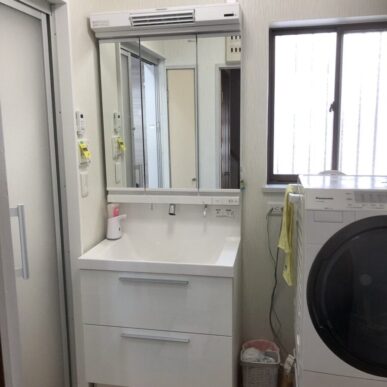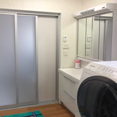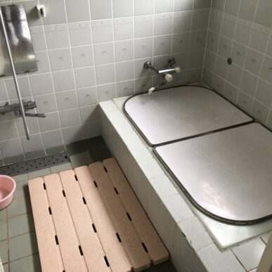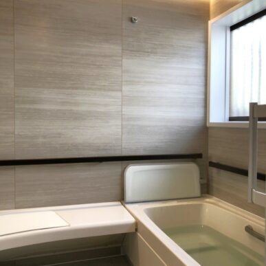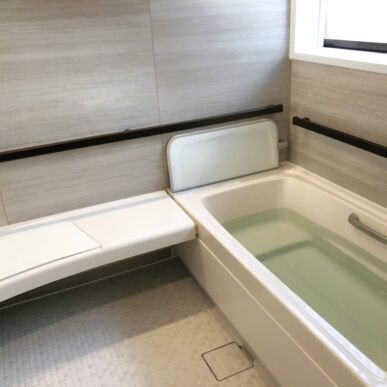 足の不自由なご家族のため、座ったまま洗い場から浴槽まで移動できるスパージュのベンチカウンターと座って使えるフタ(マルチボード)を採用いたしました。