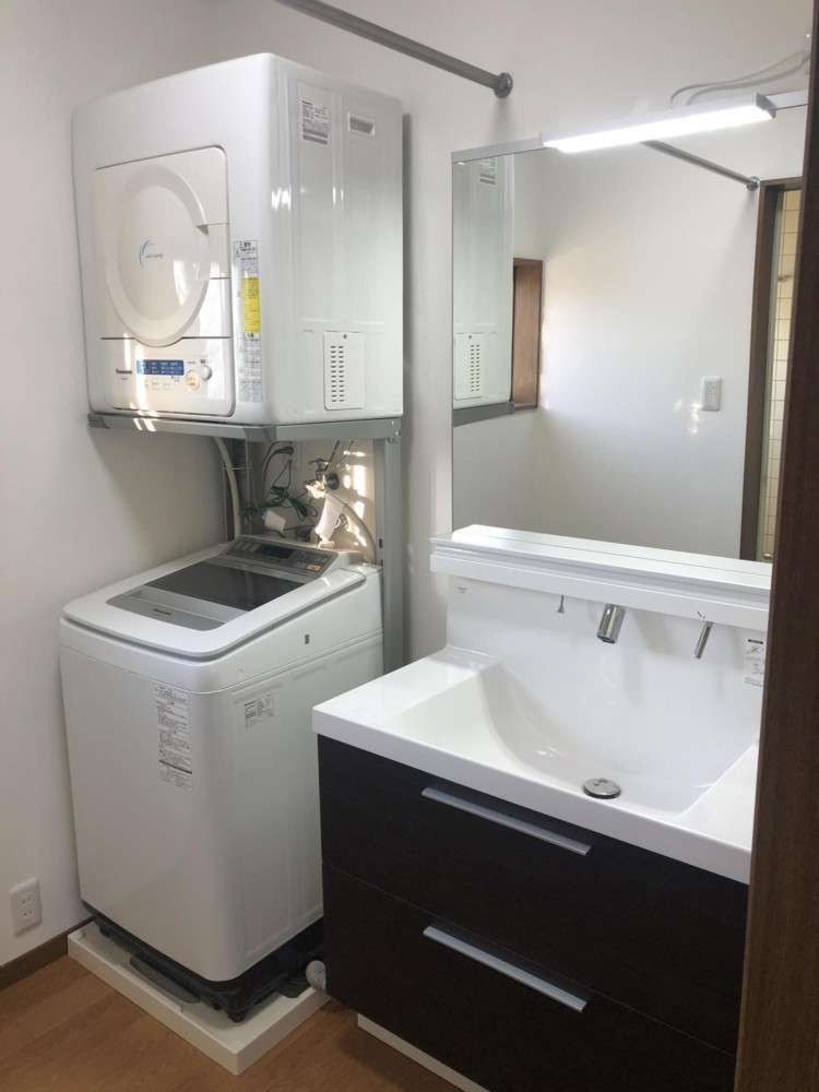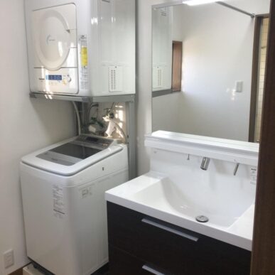 もともと洗濯パンの間口が900㎜、化粧台の間口が750㎜でしたが排水位置を変更し、洗濯パン650㎜・洗面化粧台間口900㎜に変更しました!洗面化粧台は自動水栓を選定しているので手をかざすだけで水が出ます!